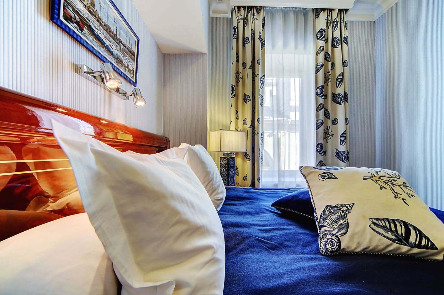 Aussicht auf den ruhigen Innenhof des Hotels. Schlafzimmer – ein großes Bett großes King-size DBL (180*200) oder 2 Einzelbetten (90*200), Teppichboden, Bettbezüge und Vorhänge in Pastellfarben, Stuhl und Schreibtisch mit High-Speed-Internetanschluss, geräumiger Kleiderschrank, Klimaanlage, LCD-Fernseher mit Satelliten-TV und Internetanschluss, Minibar, Safe, Telefon mit Voicemail. Badezimmer mit Duschkabine, Badeartikel, Hausschuhe und Handtücher.