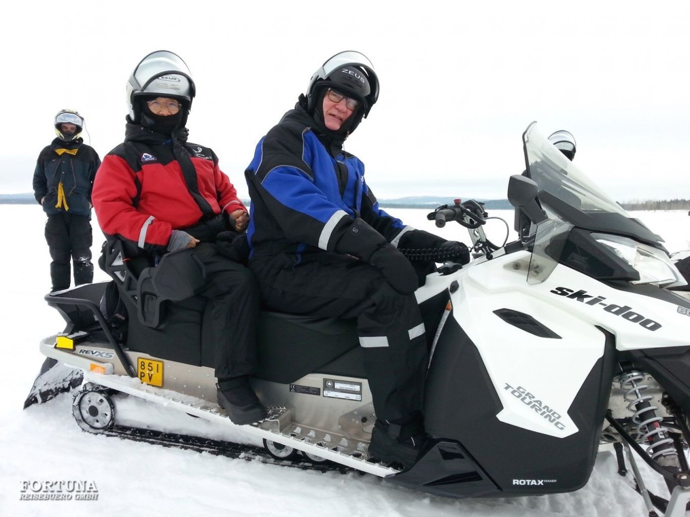 | Motorschlittenfahrt. Die Motorschlittensafari beginnt in Inari. Einweisung in das Fahren mit Motorschlitten und um ca. 10.30 Uhr beginnt der Skidoo-Spaß. Es sind immer zwei Personen auf einem Motorschlitten. Unterwegs kehren Sie in ein Restaurant ein, in dem ein einfaches Mittagessen eingenommen wird. Getränke inkl.: Wasser, Kaffee oder Tee. | |