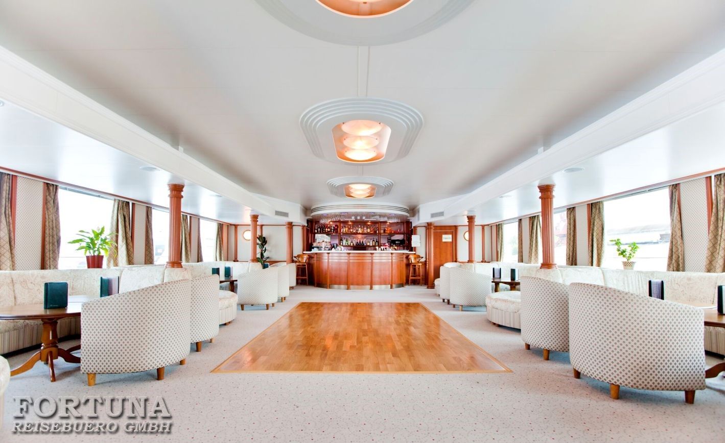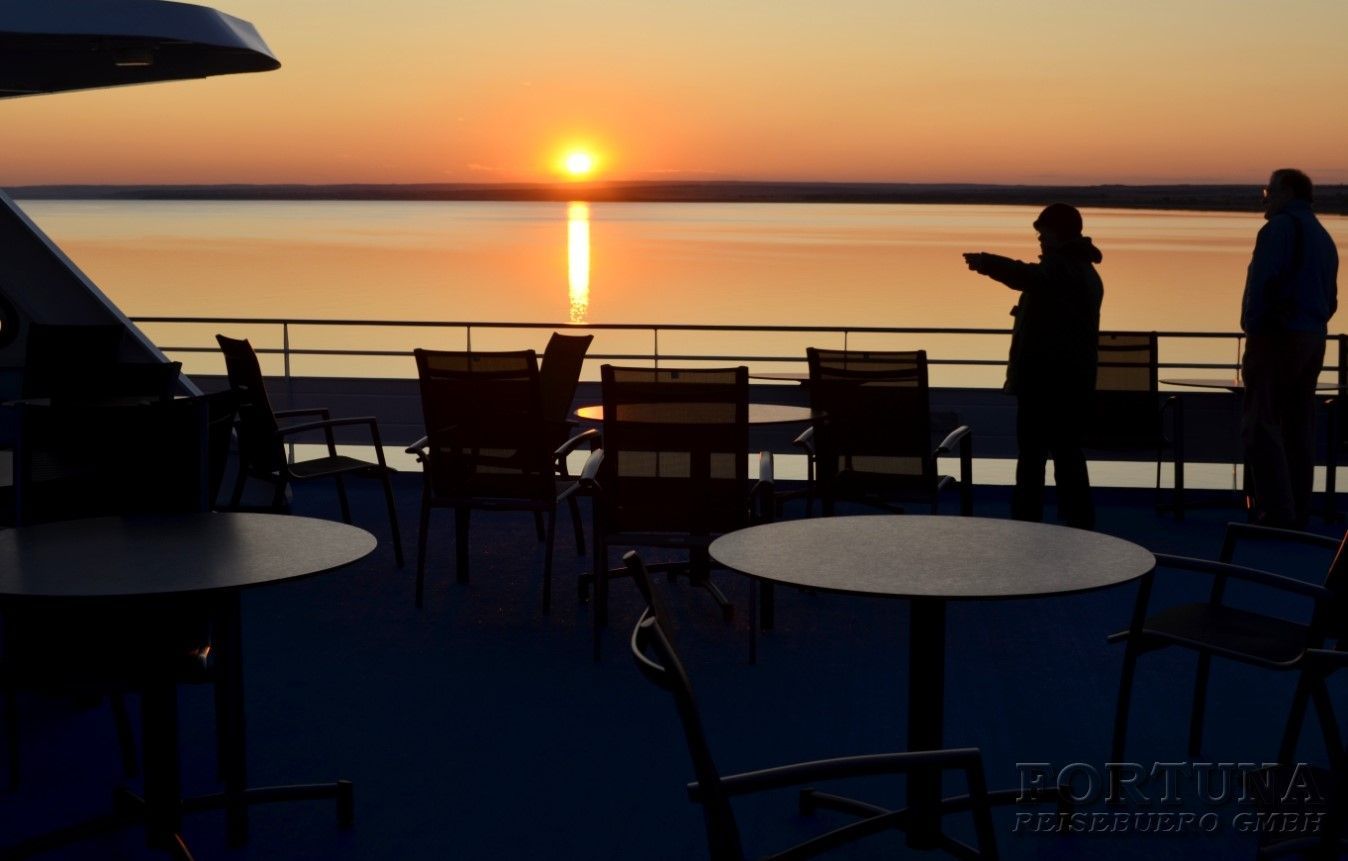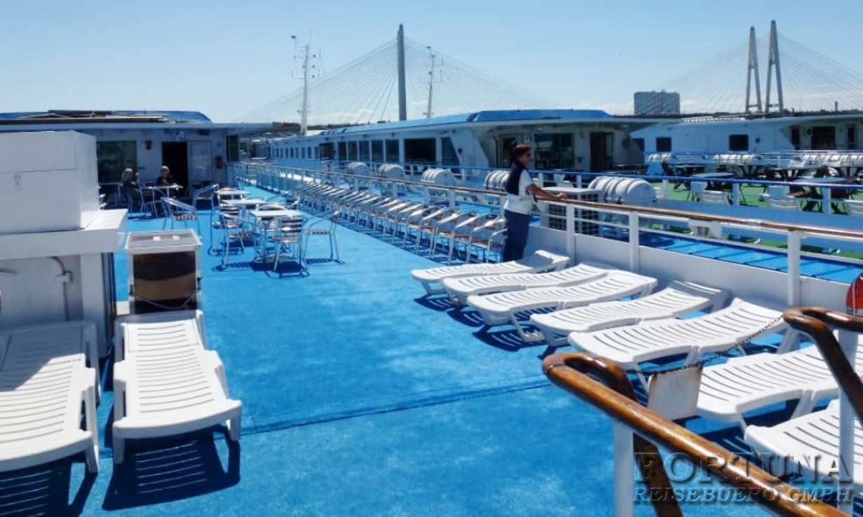Die großzügigen Rundumpromenaden mit Sitzgelegenheiten und das weitläufige Sonnendeck laden zum Entspannen und Beobachten der schönen russischen Flusslandschaften ein. Erleben Sie mit uns die Schönheiten und die Weite Russlands auf eine angenehme und entspannte Weise.