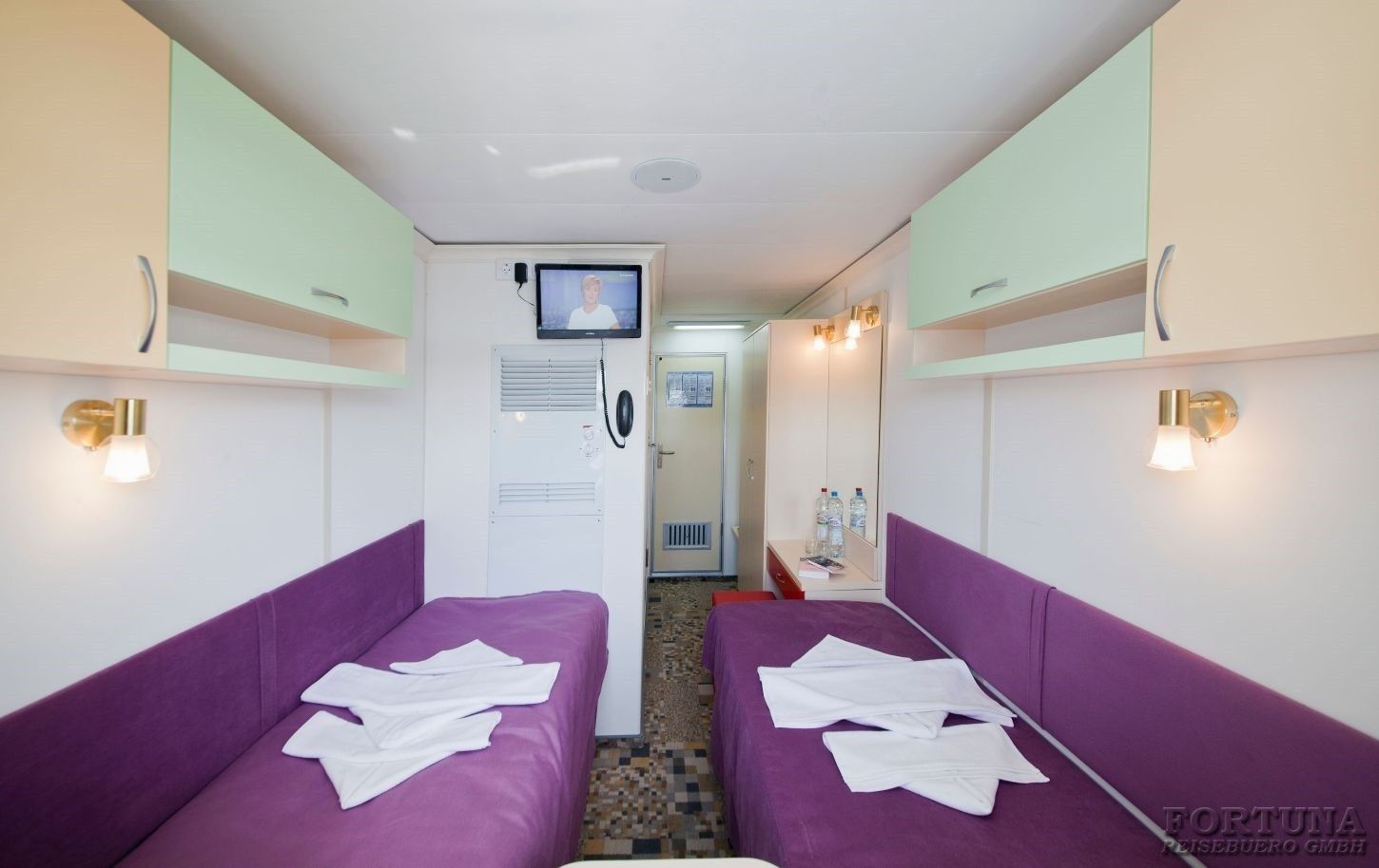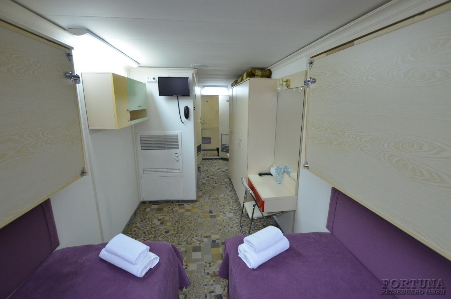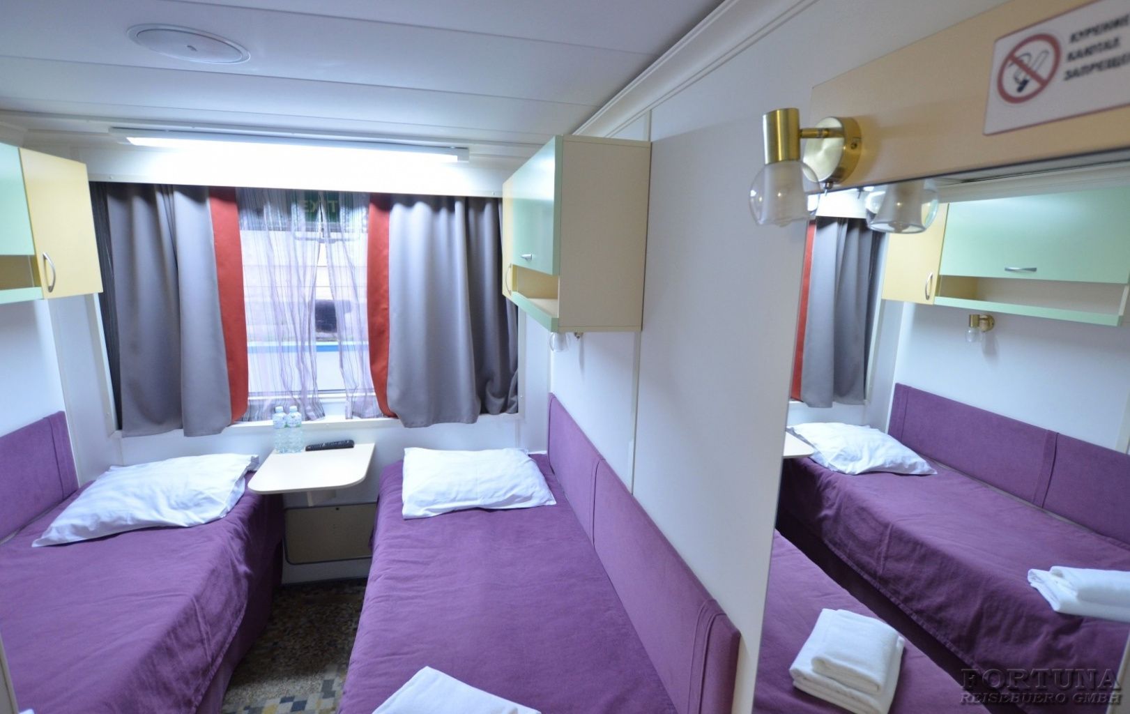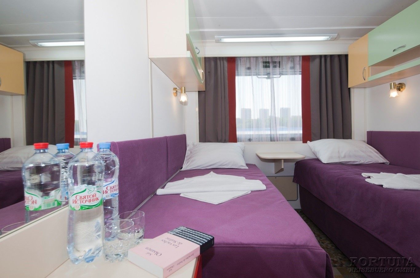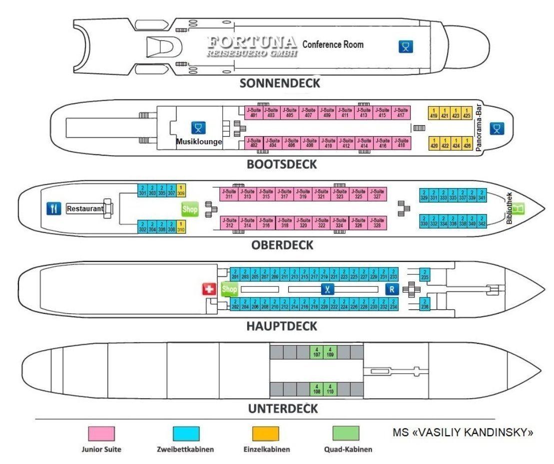 Das Flussschiff MS „V. Kandinsky“ ist mit 4 Vierbettkabinen ausgerüstet, die sich auf dem Unterdeck befinden. Hier können bis 4 Personen unterzubringen, deshalb sind diese Kabinen ideal für einen Familienurlaub. Komfortable Kabinen sind mit 4 Einzelbetten, Stühle, Spiegel und Kleiderschrank ausgestattet. Alle Vierbettkabinen haben Bullaugen nicht zum Öffnen und sind mit Dusche/WC, SAT-TV mit Flachbildschirm/Radiokanal, Klimaanlage/Heizung und Safe eingerichtet. Stromspannung 220 V.