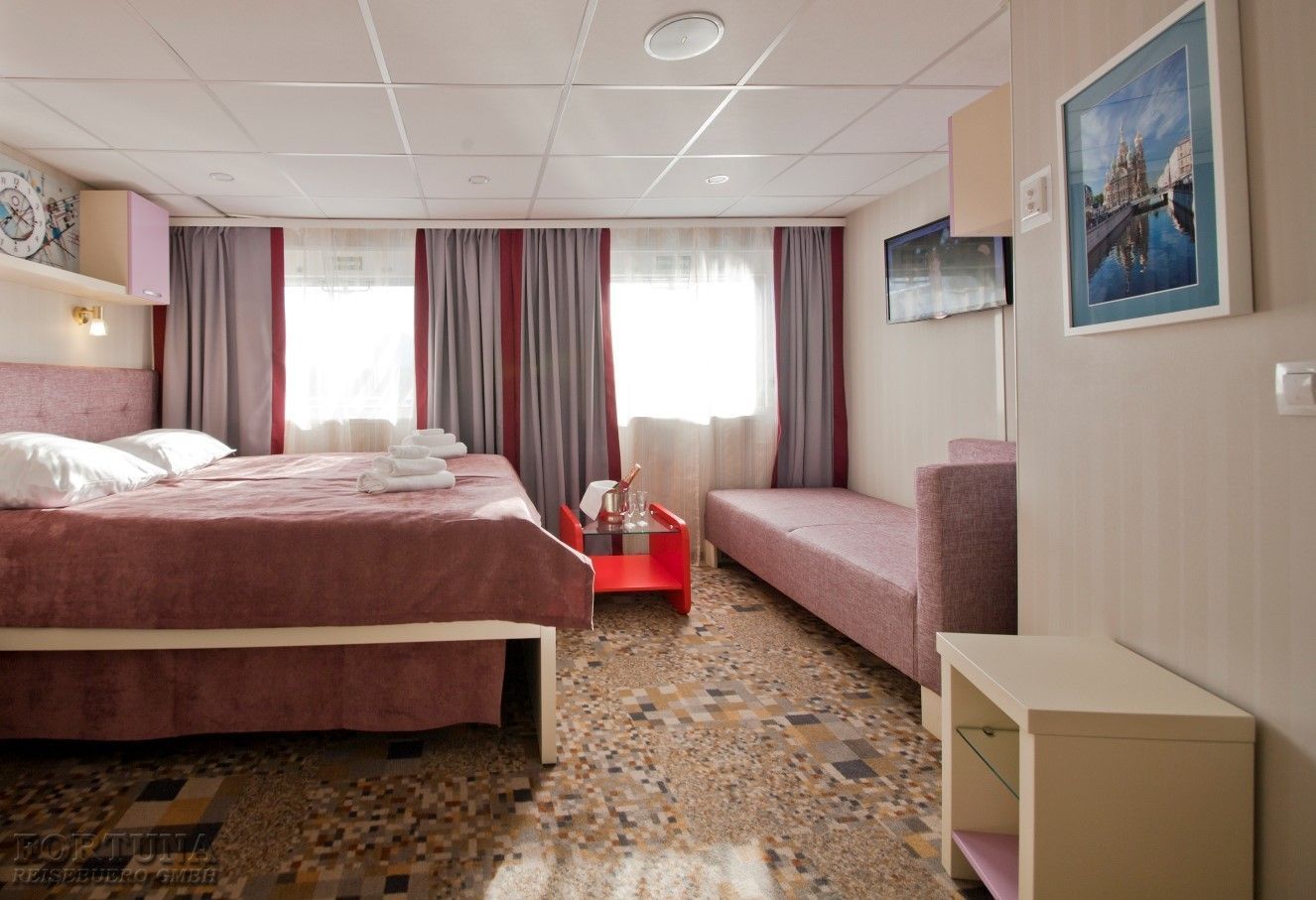 Das Flussschiff MS „V. Kandinsky“ ist mit 58 Junior-Suiten ausgerüstet, und das sind die besten Kabinen an Bord. Sie befinden sich teilweise auf dem Bootsdeck, teilweise auf dem Oberdeck. Alle Kabinen haben zwei Panorama Fenster zum Öffnen von denen aus sich ein schöner Blick auf die vorbeiziehende Landschaft öffnet. Alle Junior-Suiten verfügen über ein Zimmer und sind elegant in Pastellfarben mit einigen lebendigen Akzenten eingerichtet. Die Kabinen sind geräumig mit Doppelbett oder 2 Einzelbetten ausgestattet, mit einem Spiegel, Sofa, Nachttisch und Polsterhocker. In den Kabinen gibt es auch Föhn, Dusche/WC, Klimaanlage/Heizung, SAT-TV mit Flachbildschirm/Radiokanal, Kleiderschrank. Stromspannung 220 V. Es ist möglich, eine dritte Person in der Kabine unterzubringen - diese Person kann auf dem Sofa schlafen.