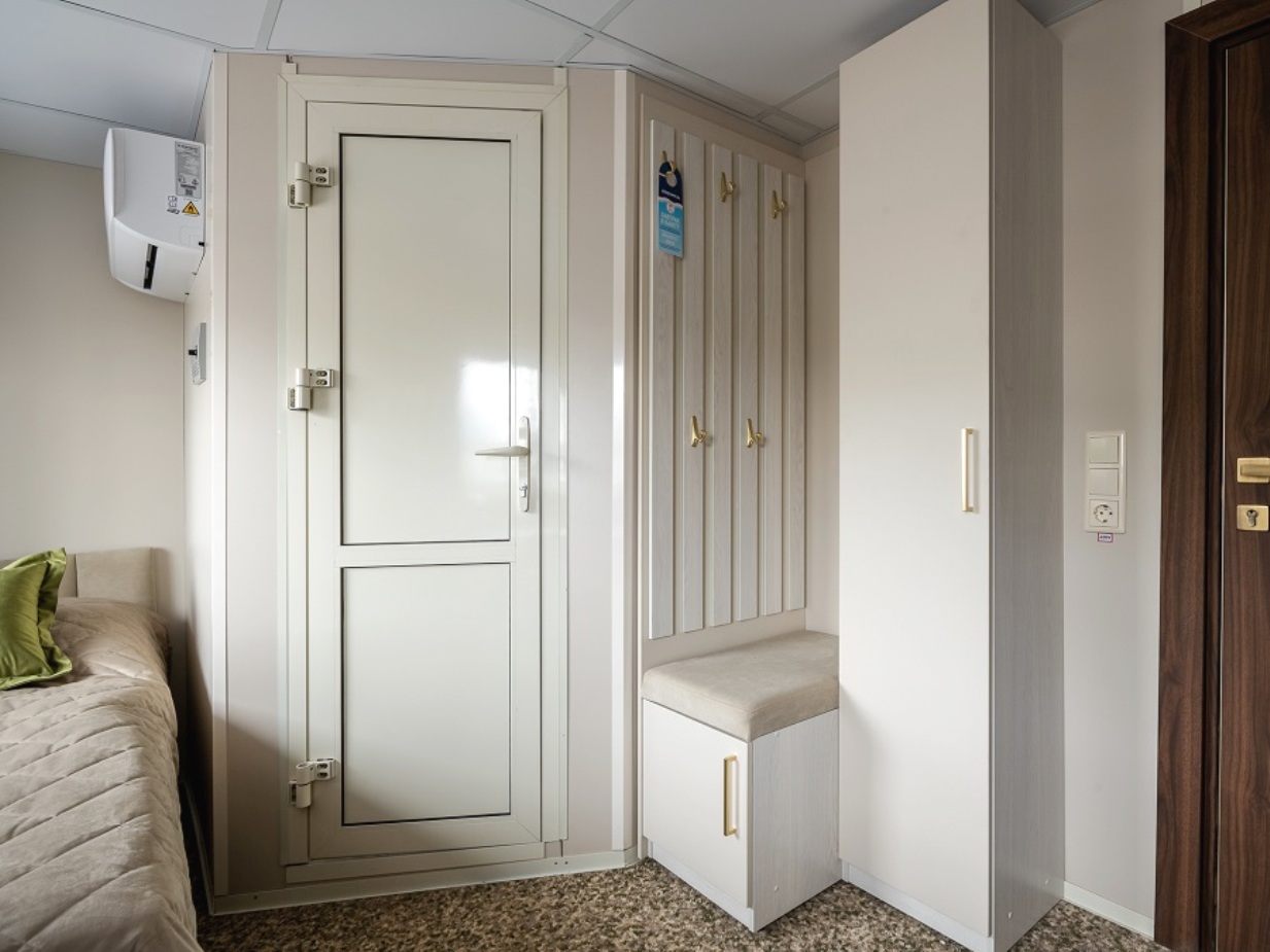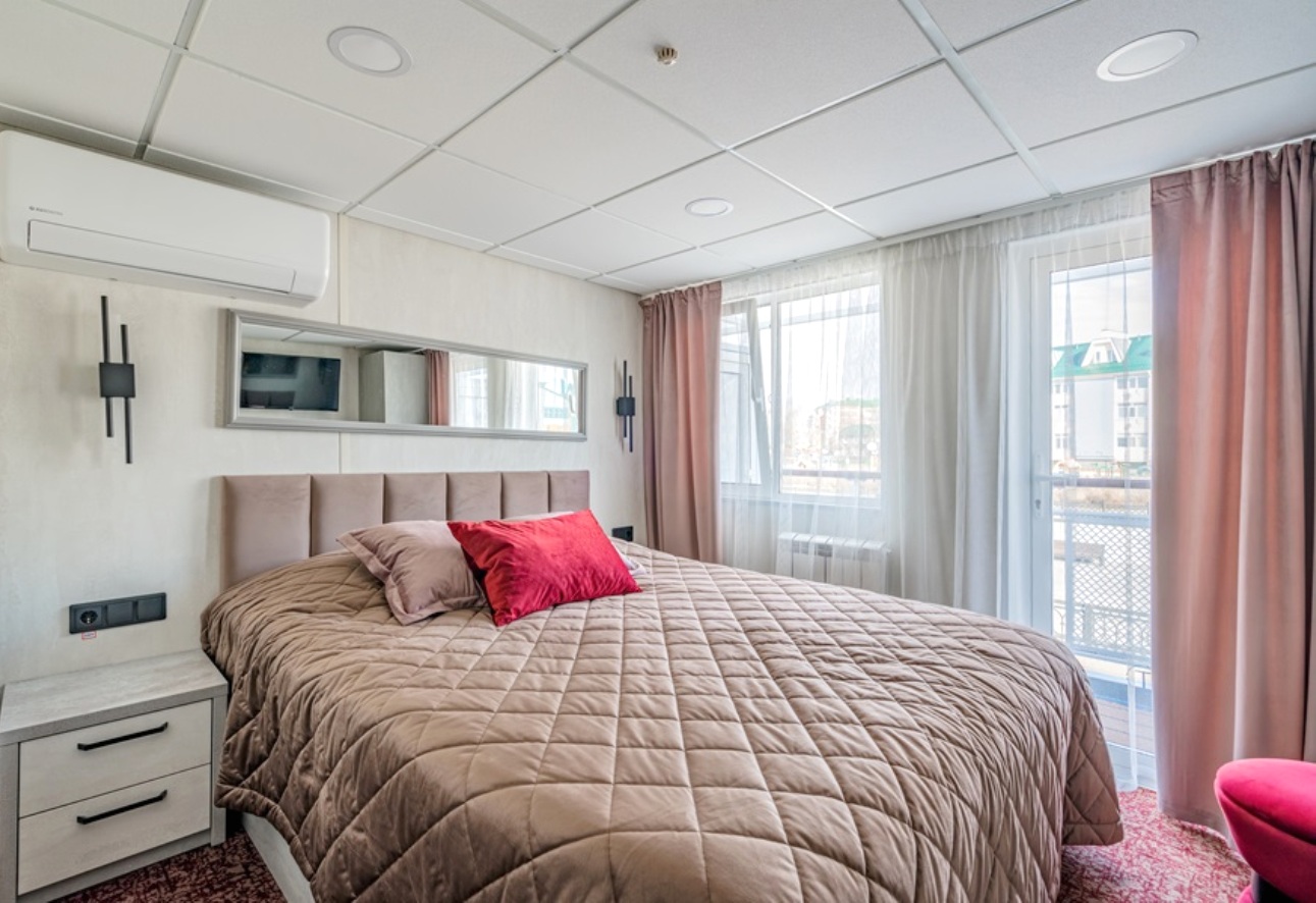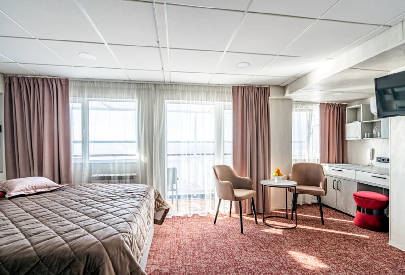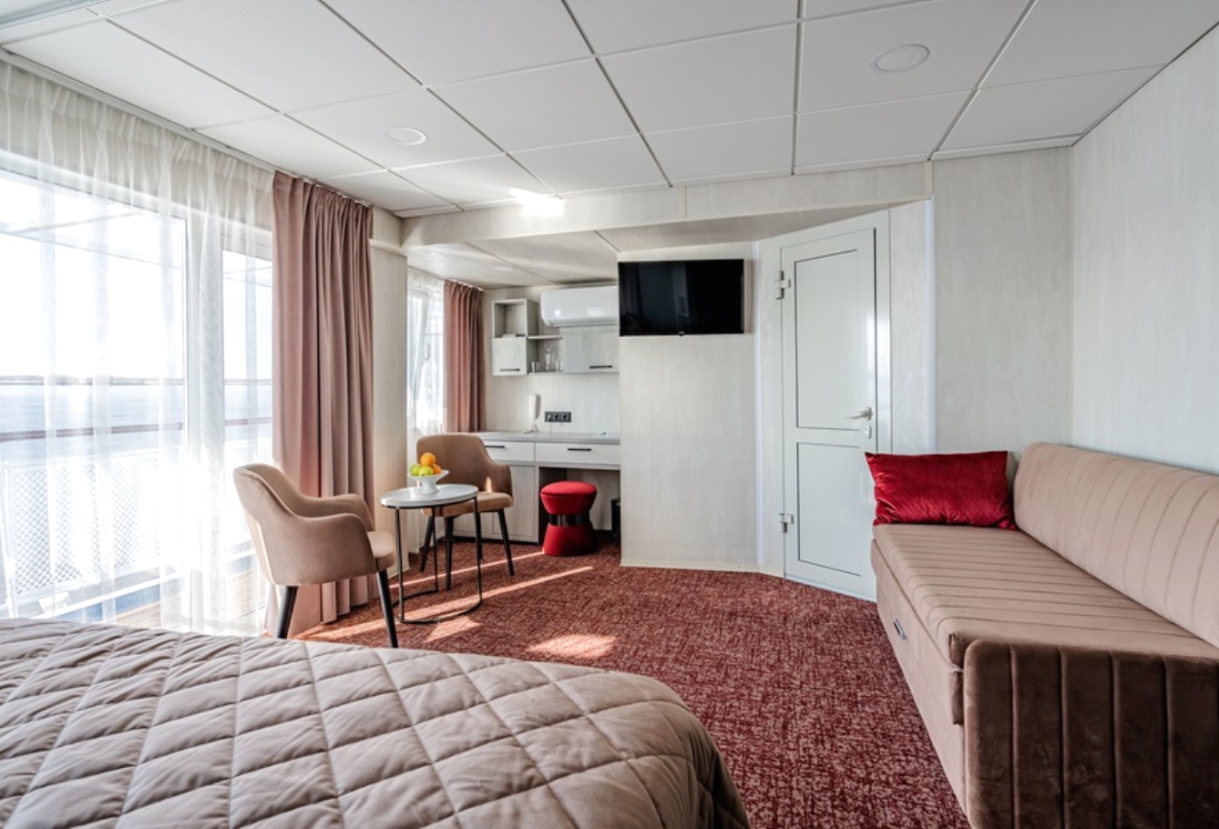 Die Kabine verfügt über ein französisches Bett (nicht trennbar) , großes Sofa, Nachttische, Kleiderschrank, Bücherregale, Schreibtisch, Stuhl, Couchtisch, Safe, Spiegel, Mini-Kühlschrank, Flachbildschirm-Fernseher mit Satellitenempfang, Haartrockner, Kapsel-Kaffeemaschine (unbegrenzte Anzahl von Kaffeepads), notwendige Anzahl von europaeische 220V-Steckdosen, Bord-Radio und Telefon, Panorama-Fenstern und diese Kabinen verfügen über eine Zentral- und Zusatzklimaanlage/-heizung. Balkon mit Möbeln zum Entspannen.