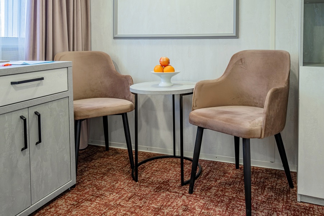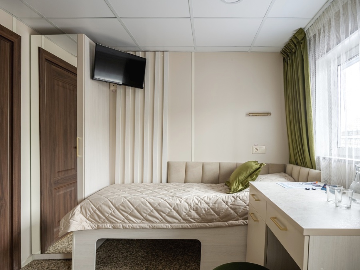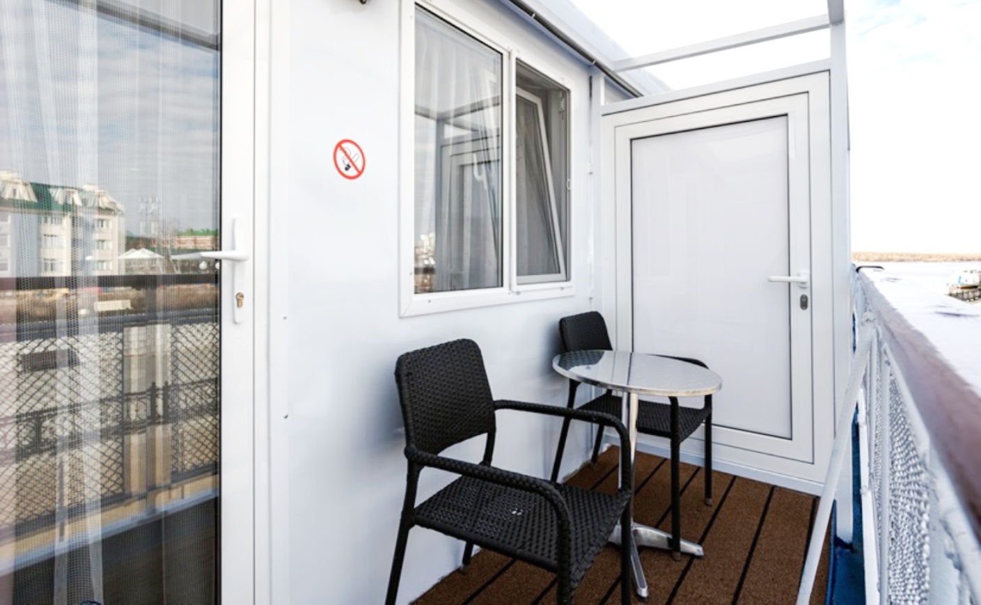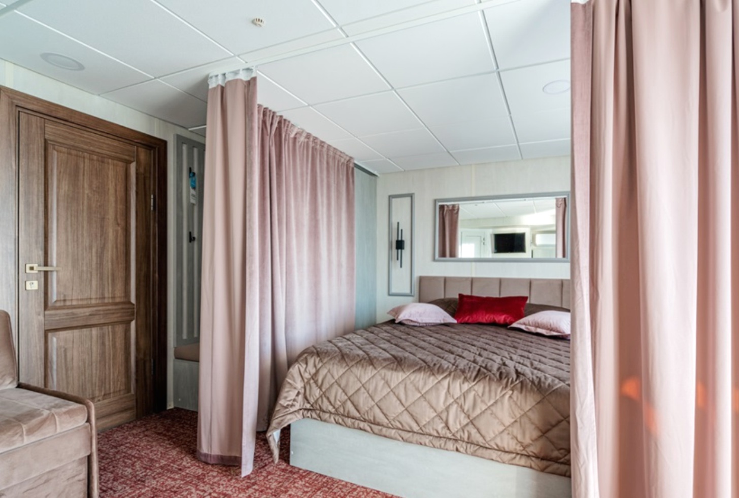 Die Kabine verfügt über ein französisches Bett (nicht trennbar) , großes Sofa, Nachttische, Kleiderschrank, Bücherregale, Schreibtisch, Stuhl, Couchtisch, Safe, Spiegel, Mini-Kühlschrank, Flachbildschirm-Fernseher mit Satellitenempfang, Haartrockner, Kapsel-Kaffeemaschine (unbegrenzte Anzahl von Kaffeepads), notwendige Anzahl von europaeische 220V-Steckdosen, Bord-Radio und Telefon, Panorama-Fenstern und diese Kabinen verfügen über eine Zentral- und Zusatzklimaanlage/-heizung. Balkon mit Möbeln zum Entspannen.