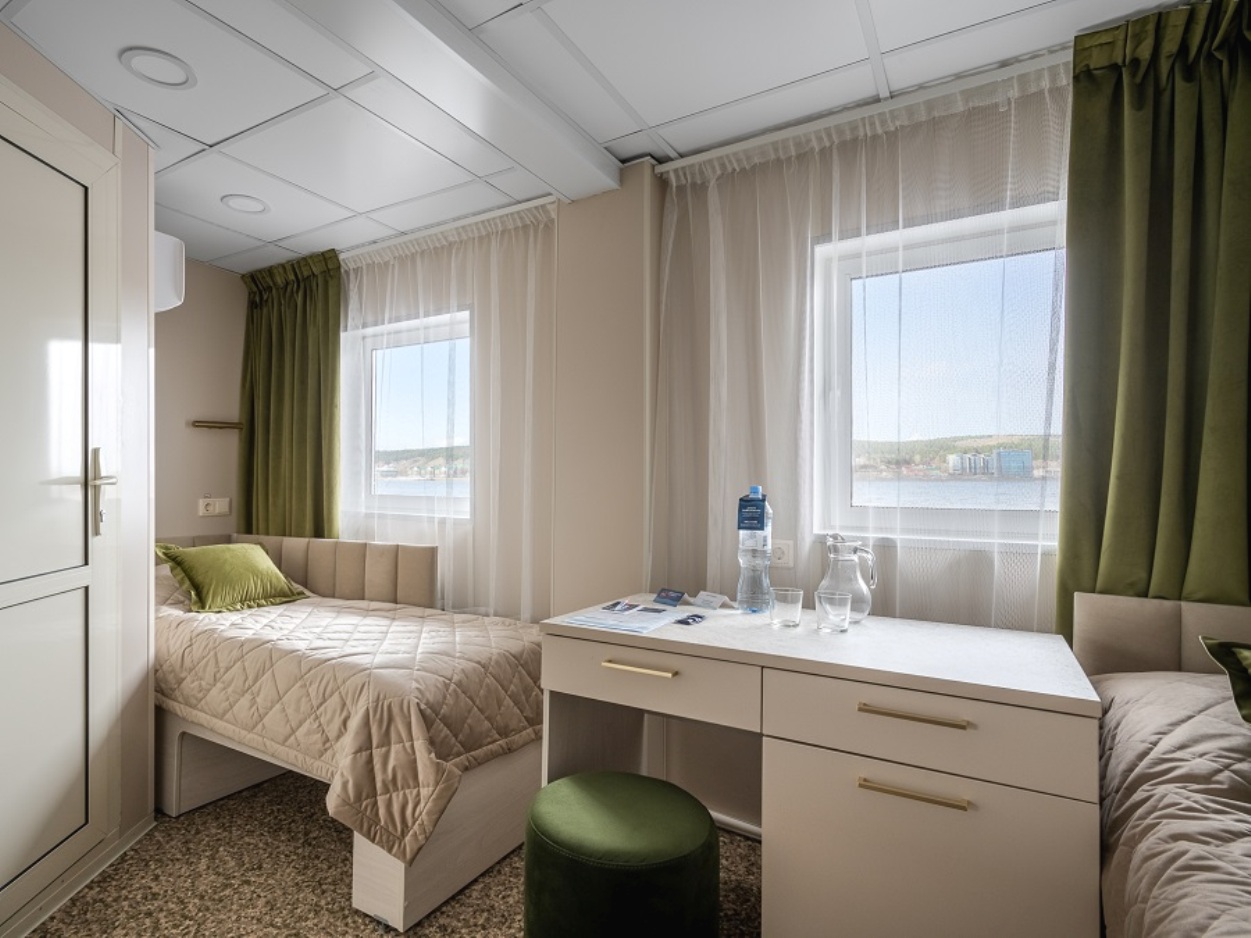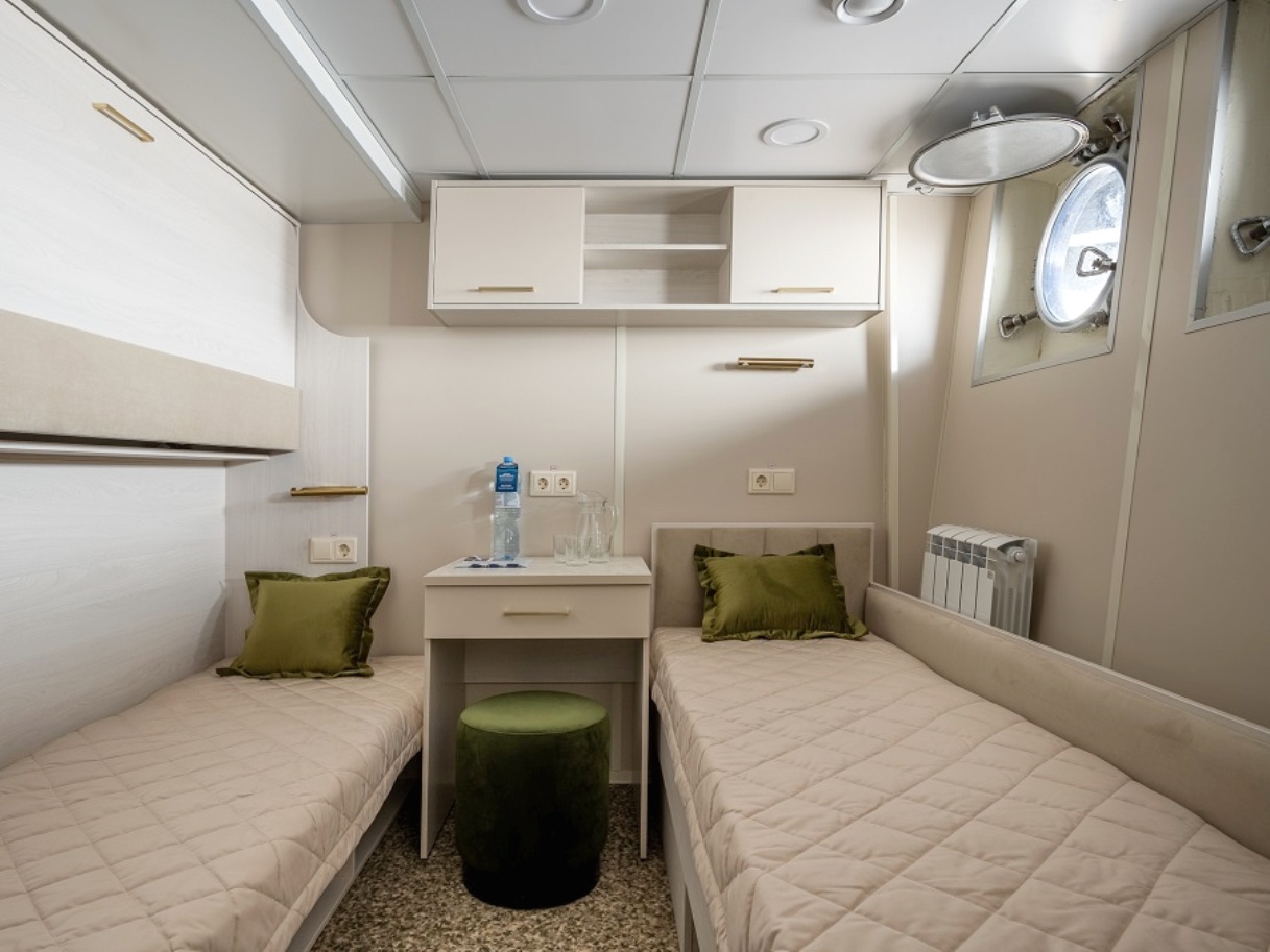 Die Kabinen verfügen über zwei Einzelbetten, Nachttisch, Kleiderschrank, Stuhl, Tisch, Flachbildschirm-Fernseher mit Satellitenempfang, Mini-Kühlschrank, Spiegel, Haartrockner, Bord-Radio und Telefon, Kuscheldecke für jeden Gast, europaeische 220V-Steckdosen, Kleiderbürste, Panorama-Fenster zum Öffnen. Die Kabinen verfügen über zentrale Klimaanlage und zentrale Heizung.