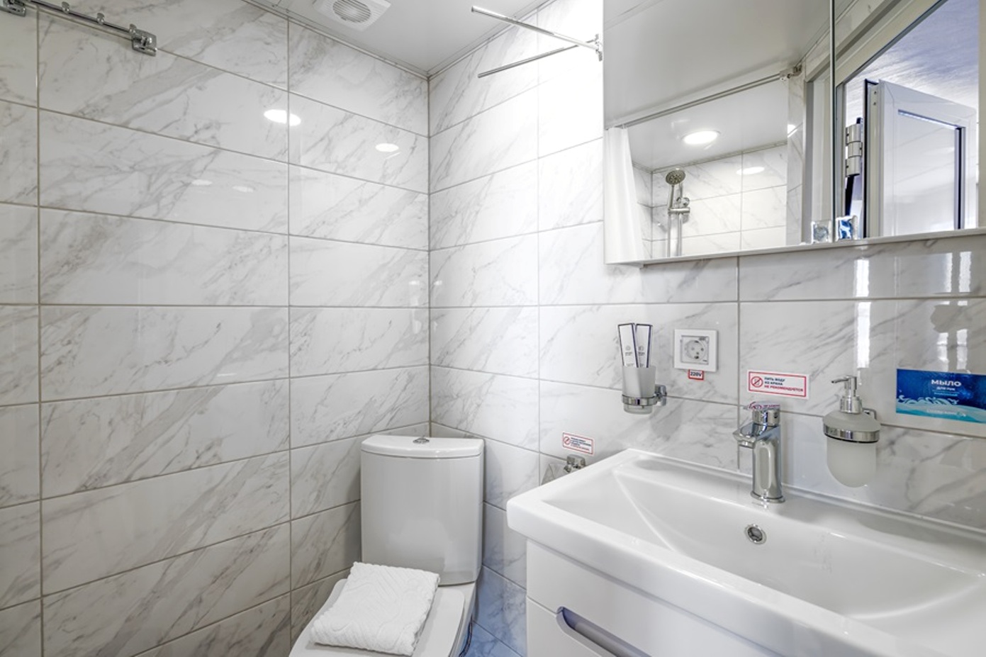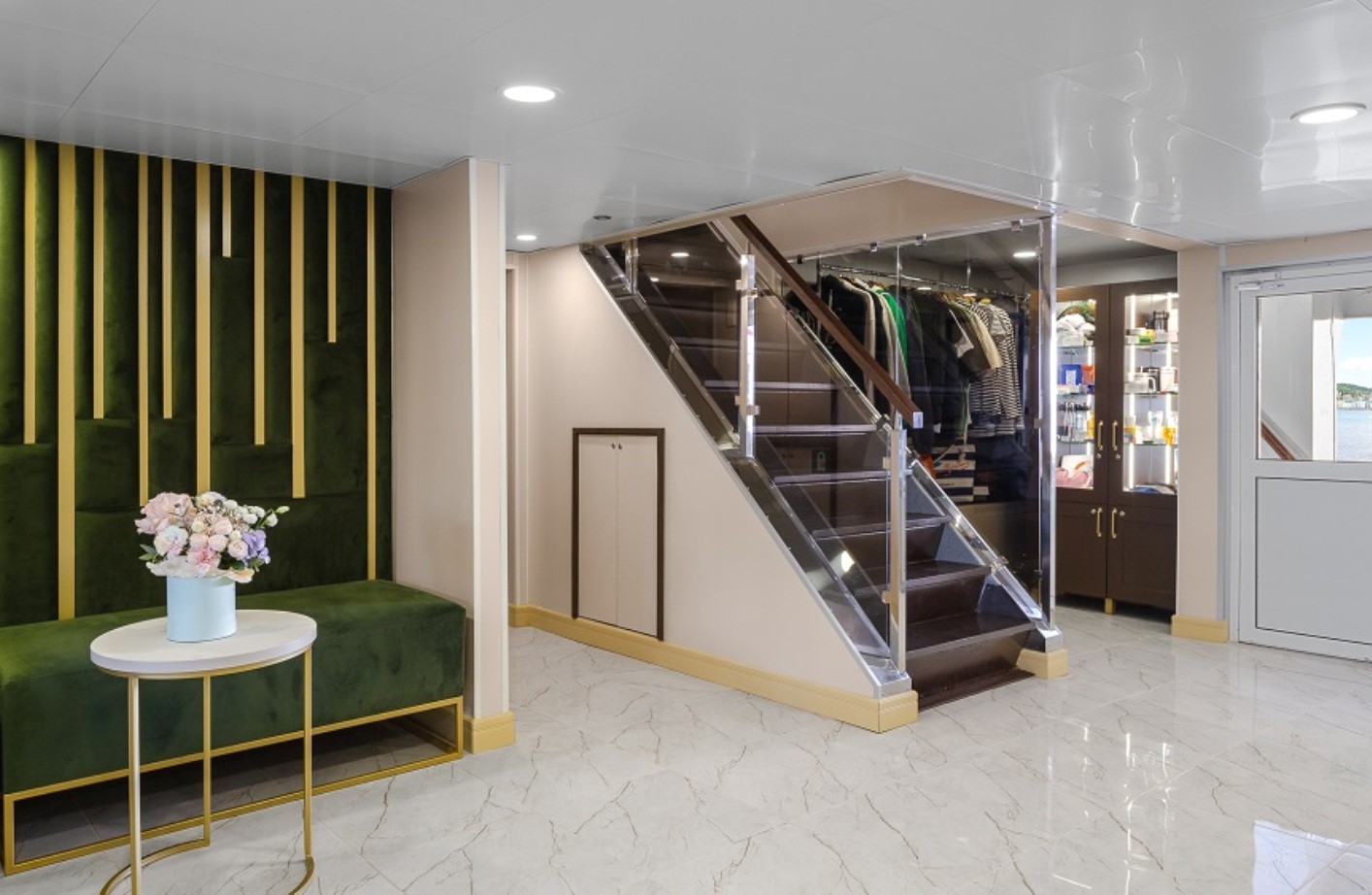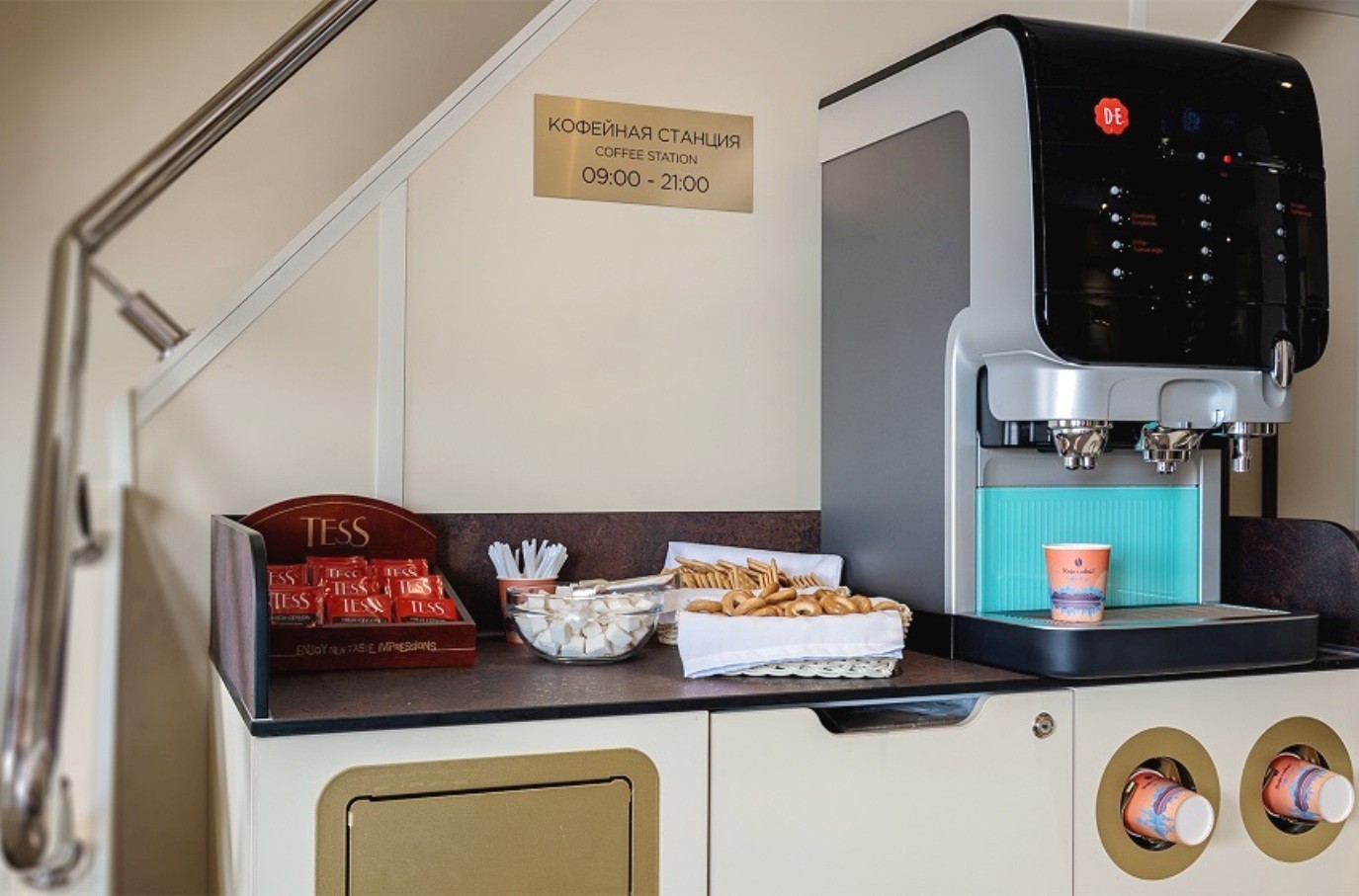 In den Kabinen stehen den Gästen auch zur Verfügung: Toilettenartikel, Bademantel, Schlafmasken, Hausschuhe, Geschirr und Besteck, „Willkommenskorb“ (Sekt, Obst), Trinkwasser, Teegeschirr, Minibar (gegen zusätzlichen Bezahlung), Kapsel-Kaffeemaschine (die erste Tasse – kostenlos).