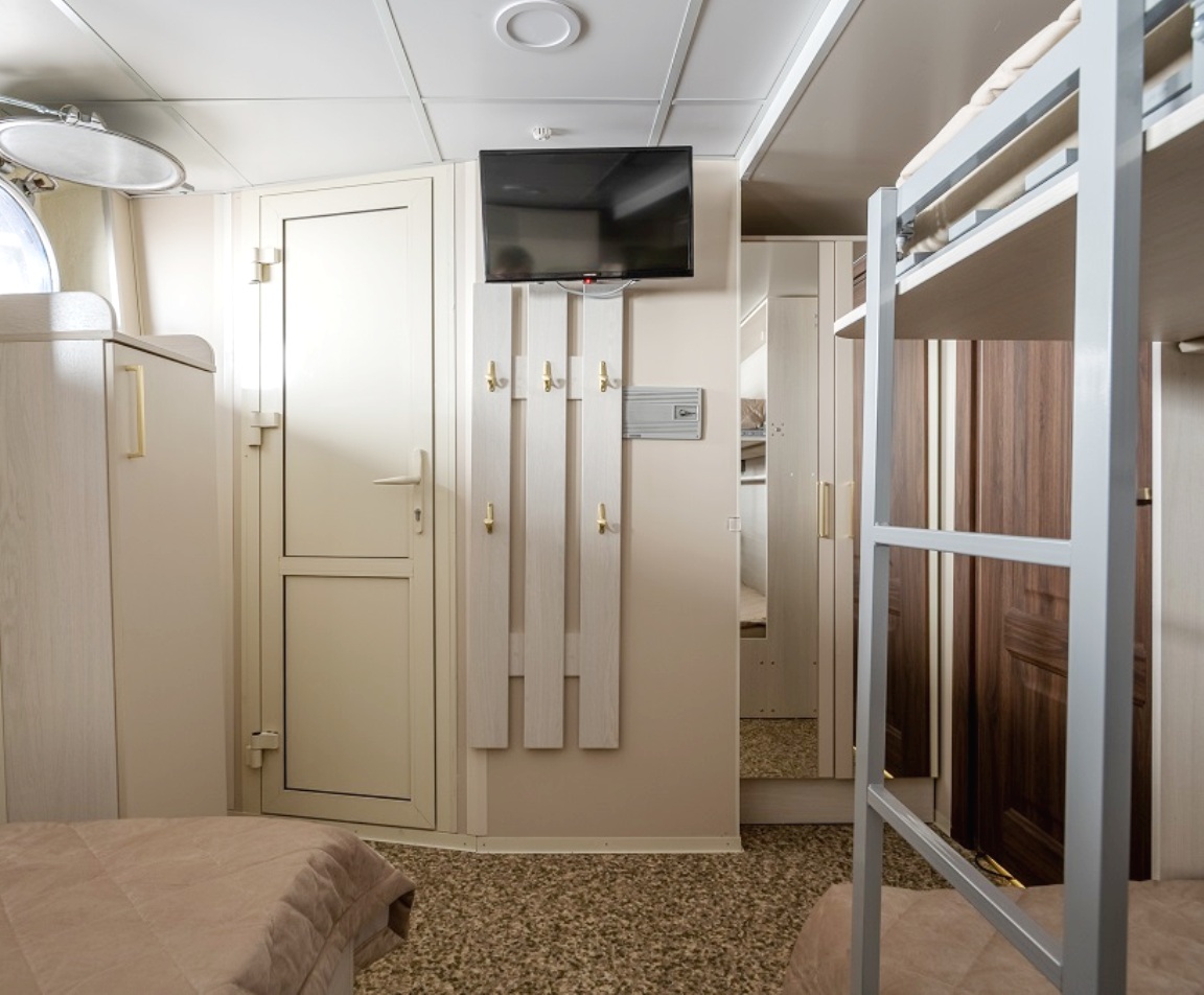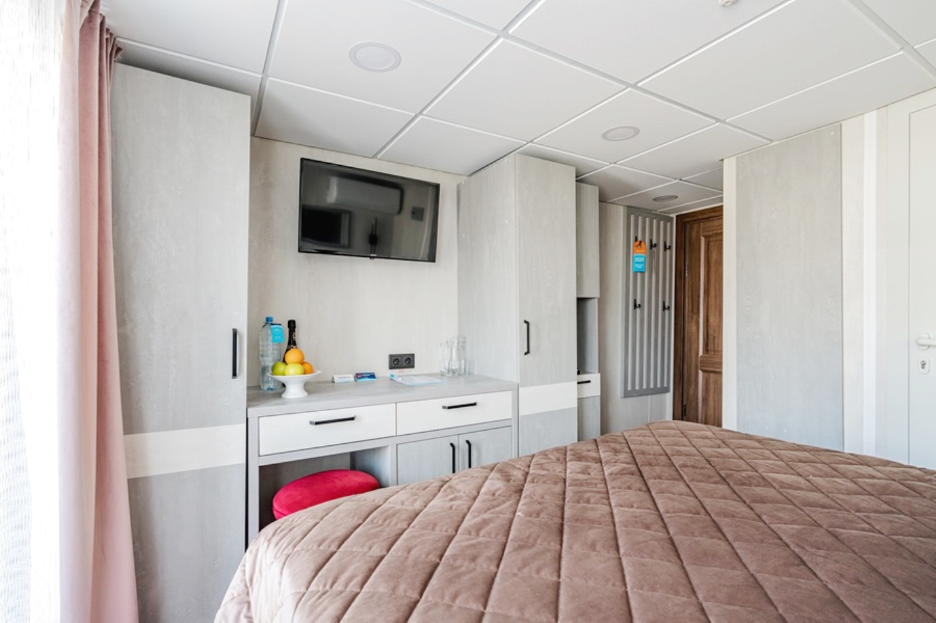 Die Kabinen verfügen über ein Doppelbett (auf Wunsch trennbar), zwei Nachttische, Kleiderschrank, Stuhl, Tisch, Flachbildschirm-Fernseher mit Satellitenempfang, Mini-Kühlschrank, Safe, Bord-Radio und Telefon, Haartrockner, Spiegel, Kuscheldecke für jeden Gast, europaeische 220V-Steckdosen, Panorama-Fenster.
