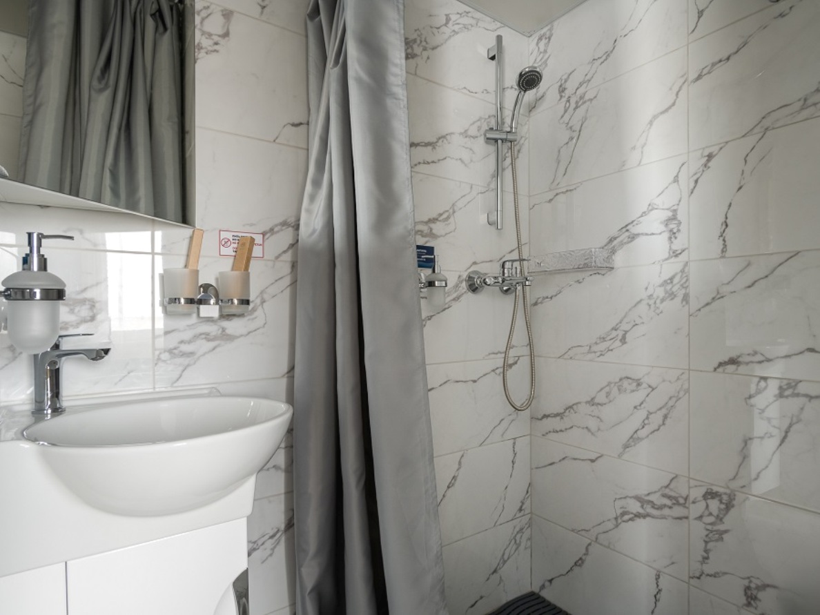 Großzügige DELUX-Kabinen mit allem Komfort (Dusche, WC, Waschbecken). Das Badezimmer ist mit einem Waschbecken, Dusche und WC, netten Toilettensachen ausgestattet.