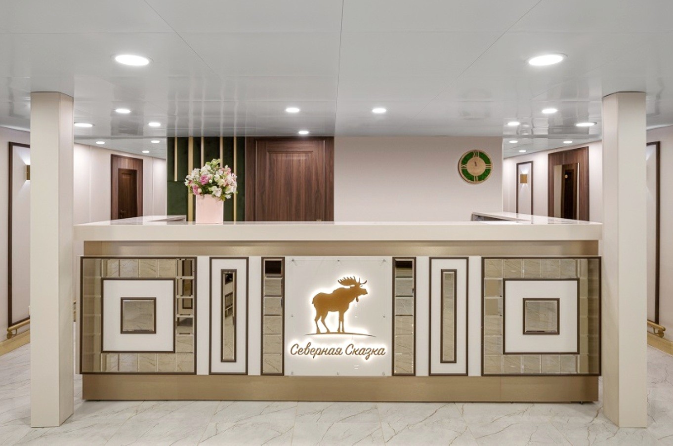 Rezeption ist ein Verwaltungsschalter, der während einer Flusskreuzfahrt auf dem Hauptdeck des Motorschiffs Nördliches Märchen genutzt werden kann. Hier wird der Passagier von der für Empfang, Unterkunft, Bordprogramm und Ausflugsorganisation zuständigen Sachbearbeiterin mit einem lächelnden Blick begrüßt. Die freundliche Rezeptionistin hilft Ihnen beim Check-in an Bord und beim Transport des Gepäcks zur reservierten Kabine. An der Rezeption bekommen Sie die Schlüssel für die Kabine und ein Ausflugsprogramm – Ausflüge konnte man sich übrigens aussuchen. Willkommen auf der russischen Sibirien-Kreuzfahrt!