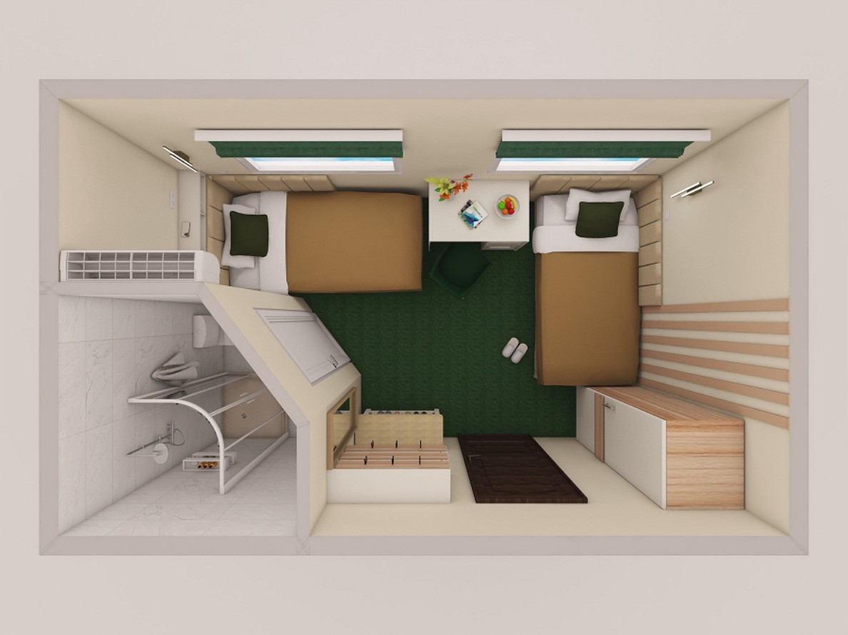 Die Kabinen verfügen über zwei Einzelbetten (Betten können nicht zusammengeschoben werden), Nachttisch, Kleiderschrank, Stuhl, Tisch, Flachbildschirm-Fernseher mit Satellitenempfang, Kühlschrank, Haartrockner, Bord-Radio, Kuscheldecke für jeden Gast, europaeische 220V-Steckdosen, Kleiderbürste, Spigel und Fenster zum Öffnen. Diese Kabinen verfügen über eine Zentral- und Zusatzklimaanlage/-heizung.