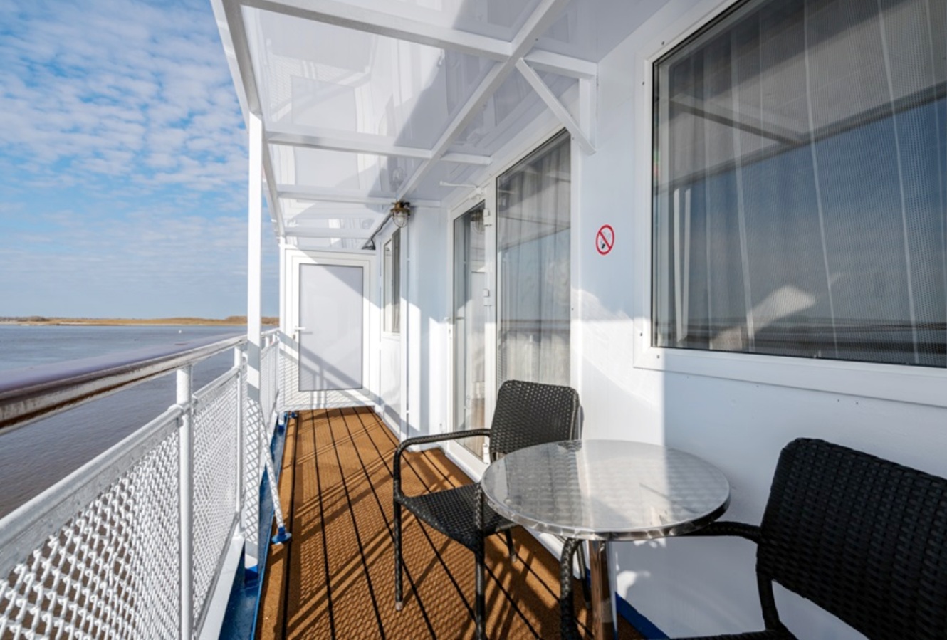 Die Kabinen verfügt über ein Doppelbett (auf Wunsch trennbar), Nachttische, Kleiderschrank, Stuhl, Tisch, Flachbildschirm-Fernseher mit Satellitenempfang, Mini-Kühlschrank, Safe, Bord-Radio und Telefon, Haartrockner, Spiegel, Kuscheldecke für jeden Gast, europaeische 220V-Steckdosen, Panorama-Fenster. Balkon mit Möbeln zum Entspannen.