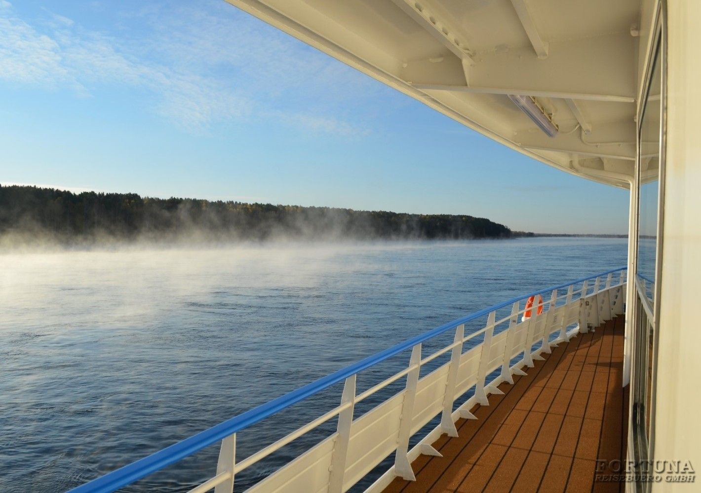 Auf dem Sonnendeck können Sie sich bei sonnigem Wetter sonnen oder einfach nur Zeit im Freien verbringen. Stühle und Tische stehen den Passagieren auf dem offenen Deck zur Verfügung. Hier auf dem obersten Deck des Motorschiffs „Maxim Gorki“ zu Ihren Diensten: Jeden Morgen werden den Passagieren des Flusskreuzfahrtschiffes gesundheitsfördernde Gymnastik, Yoga- und Pilates-Kurse unter Anleitung eines Fachlehrers angeboten. Es ist großartig, den Tag auf dem offenen Deck, an der frischen sibirischen Flussluft, mit ein wenig Bewegung zu beginnen. Auf der Decksterrasse, „auf dem Dach“ des Flussschiffes wird nicht nur abwechslungsreiche, sondern auch gesunde Erholung geboten. Passagiere können hier auch Zeit mit einem Buch verbringen, Spiele spielen oder einfach den Jenissei-Blick genießen, wann immer es ihnen passt. Bei sibirischer Flusskreuzfahrt werden es besonders romantische Paare lieben, die Sonnenauf- und untergänge zu bewundern! Auf dem Bootsdeck und Sonnendeck gibt es immer genug Platz für alle, und das Wetter ist oft gut.