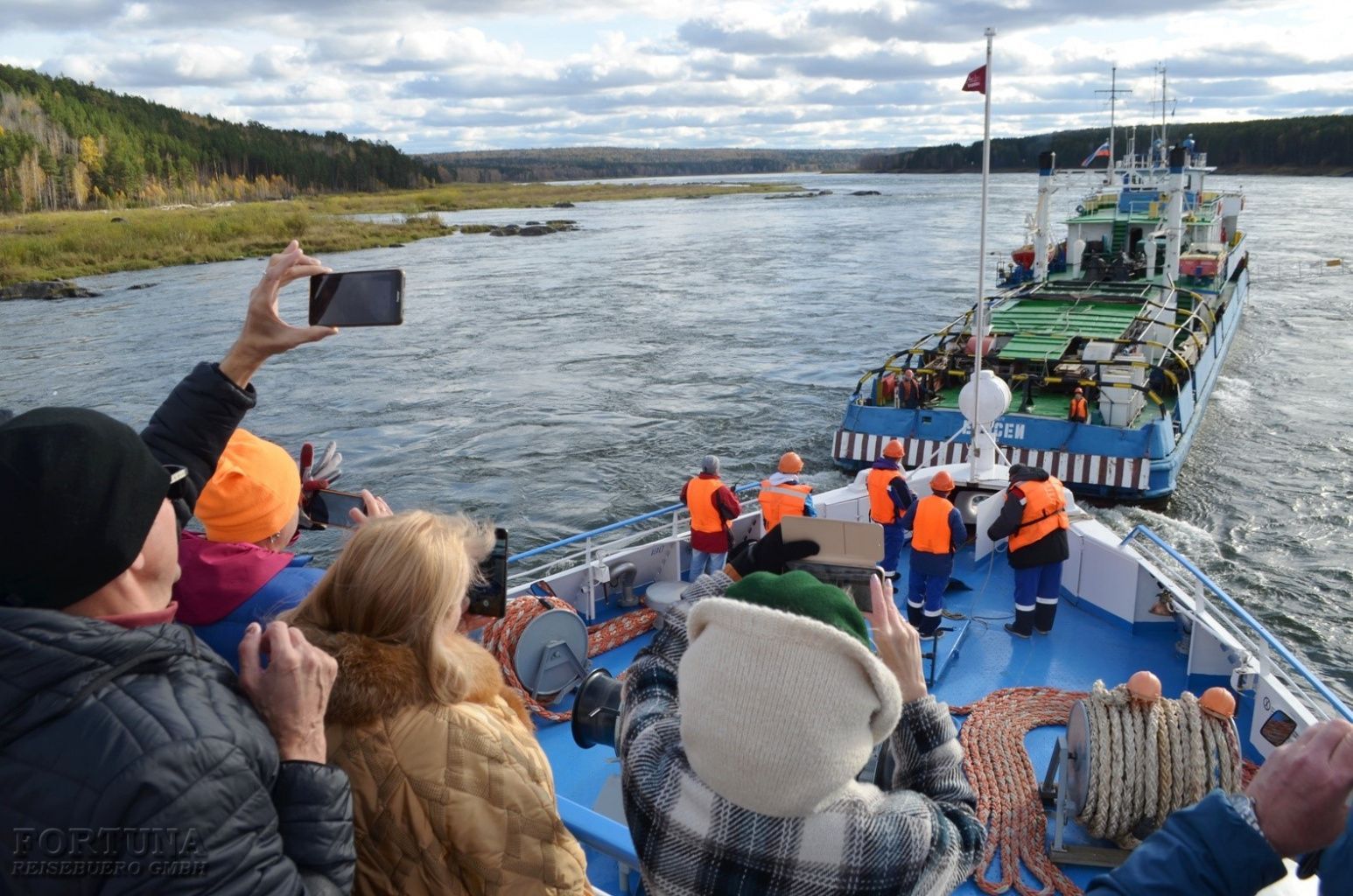 Passage: Verengung des Jenissei auf 800 Meter, "Urochischtische Wangen" (Felsen). Hier misst die Tiefe des Jenissei 40 bis 100 Meter. Inseln: „Schiffchen" und "Barochka". Auf einer der Inseln wurde im Jahr 1946 ein dort lebender “Menschenfresser” gefangen, der seine drei Frauen gegessen hatte! Hier, 844 km von Krasnoyarsk, wurde zu Zeiten der Sowjetunion ein Wasserkraftwerk geplant. Wenn es gebaut worden wäre, hätte sich der Jenissei bis auf 100 km ausgebreitet.
