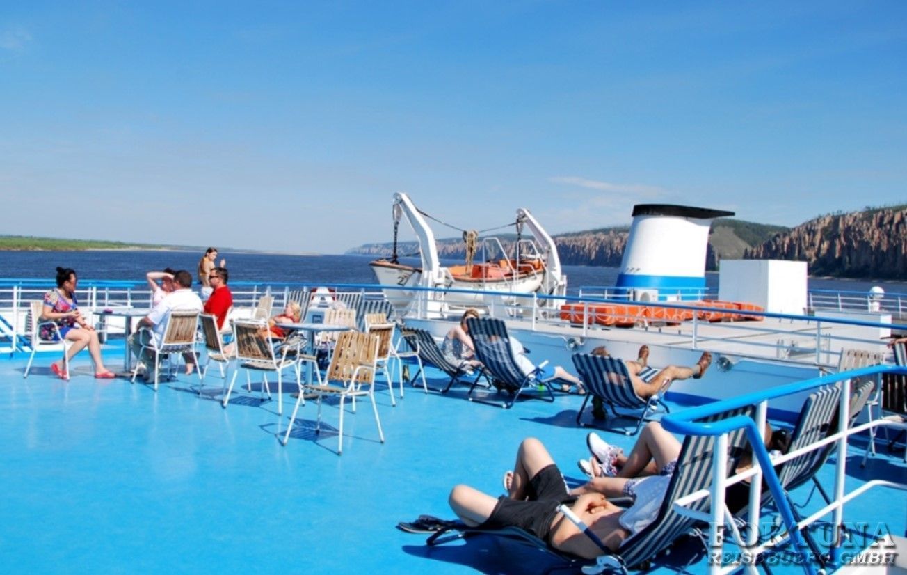 In der Nacht legt das Schiff eine ziemlich große Strecke flussaufwärts zurück und wir nähern uns den Lena-Felsen. In der Ferne sind schon die ersten Spitzen der Lena-Felsen zu sehen – ein atemberaubender Anblick. Die Lena-Felsen sind die sich am rechten Ufer des Flusses Lena erstreckenden Klippen. Zeit, Niederschläge, Flusswasser und Wind haben hier den Felsen bizarre Formen verliehen, die zeitweise an die gotischen Kathedralen aus Ziegelsteinen erinnern. Was für ein schöner Sommermorgen! Wie schön ist die Lena! Wie schön ist das Leben! Um 10:00 Uhr nähert sich das Schiff dem Ufer und legt an. Der Ort ist einfach märchenhaft, den die Felssäulen ragen zu 200 m in die Höhe auf. An der Anlegestelle befinden sich das Verwaltungsgebäude des Parks, eine Infotafel über den Park und hier beginnt eigentlich der Pfad zur Aussichtsplattform. An diesem Tag besuchen Sie den Naturpark „Lena-Felsen”, der sich den Fluss Lena entlang erstreckt. Die Fläche von diesem unglaublichen natürlichen Felsenkomplex beträgt ca. 485 000 Hektar. Nach einer schamanischen Empfangszeremonie (Dauer ca. 30 Min.) mit rituellen Tänzen und dem traditionellen Reinigungsritual geht es hinauf auf die Felsen. Der Pfad zur Aussichtsplattform ist bestens ausgestattet und kann bei jedem Wetter benutzt werden. Schon 200 Meter vom Ufer wird es schwieriger, sich zu orientieren, Sibirien ist Sibirien. Moos und Grass, Sümpfe und viele kleine Flüsse, dichter Birken- und Lärchebestand, der Pfad ist sehr hilfreich. Aber auch er ist teilweise schwer begehbar, deshalb gibt es in regelmäßigen Abständen Rastplätze. Sportschuhe sind empfehlenswert. Endlich sind wir auf einer der Aussichtsplattformen, von der atemberaubende Landschaften zu sehen sind. Das ist sakramentaler Platz für die Einheimischen, deshalb ist es hier verboten laut zu sprechen. Von oben kann man auch schöne Aufnahmen von den unten stehenden Schiffen machen. Fast die ganze Passagierflotte versammelt sich an einem Ort, die Schiffe sehen von oben wie Spielzeugmodelle auf einer Parade aus. Einfach toll! Die vorgesehene Freizeit können Sie für Wasserfahrten, Workshops oder Wanderungen nutzen. Nehmen Sie einen Badeanzug mit. Genießen Sie diesen schönen Tag im Freien! Am Bord des Schiffes können Sie sich auch einen Dokumentarfilm über den Park anschauen. Es fällt schwer, von diesem Ort Abschied zu nehmen. Am Abend legt unser Schiff ab und nimmt Kurs auf Jakutsk. Nach diesem erlebnisreichen Tag herrscht an Decks viel Betrieb. Die aufgeheizte Stimmung ist auch im Musiksalon des Schiffes zu spüren. Nach Mitternacht passiert das Schiff Pokrowsk, eine große Siedlung auf der Lena. Die Nacht, das Schiff, der Fluss, kühle frische Luft... Wie schön ist es auf dem Fluss in der Nacht! Während der Reise haben Sie eine schöne Möglichkeit, unvergesslichen Sonnenaufgang und -untergang zu bestaunen und natürlich tolle Fotos zu machen. Während der Fahrt begegnen wir auch Frachtschiffen, die uns mit einer Sirene begrüßen. An Bord von „Demjan Bedni “ stehen Ihnen zur Verfügung: komfortable Kabinen mit allen Bequemlichkeiten; ein gemütliches Restaurant, ein Musiksalon, ein Kinosaal, das Sonnendeck, auf dem Sie sich bei schönem Wetter sönnen und wunderschöne Lena-Landschaften genießen können. Außerdem verfügt das Schiff über eine Sauna, einen Friseur-Salon, einen Bügelraum und eine Ambulanz.