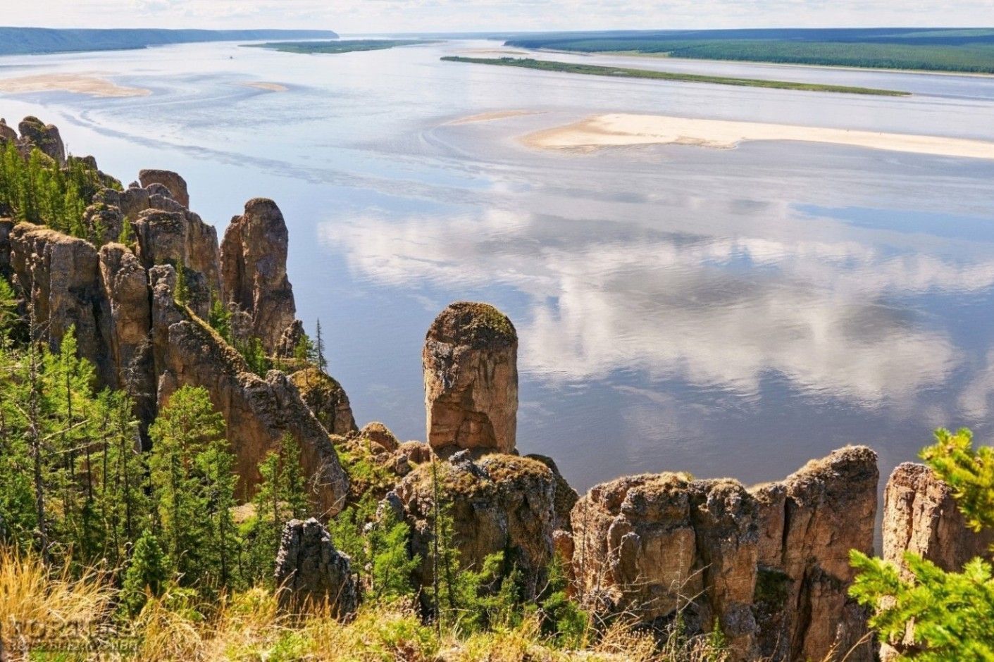 Die berühmten Lena-Felsen sind einzigartige Steinsäulen, die 100-200 Meter Höhe erreichen. Sie erstrecken sich über eine Länge von 40 km die wunderschöne Lena entlang. Dieses Naturdenkmal ist ein Ergebnis der kambrischen Explosion, die vor mehr als 500 Millionen Jahren stattfand. Die ungewöhnliche Form dieser Kalksteinfelsen wurde in den letzten 400.000 Jahren durch Erosionsprozesse geschaffen. Der Nationalpark „Lena-Felsen“/„Lenskije Stolby“ wurde 1994 gegründet. Im Juni 2012 wurde der Nationalpark in die Liste der UNESCO-Weltnaturerbestätten Russlands aufgenommen.