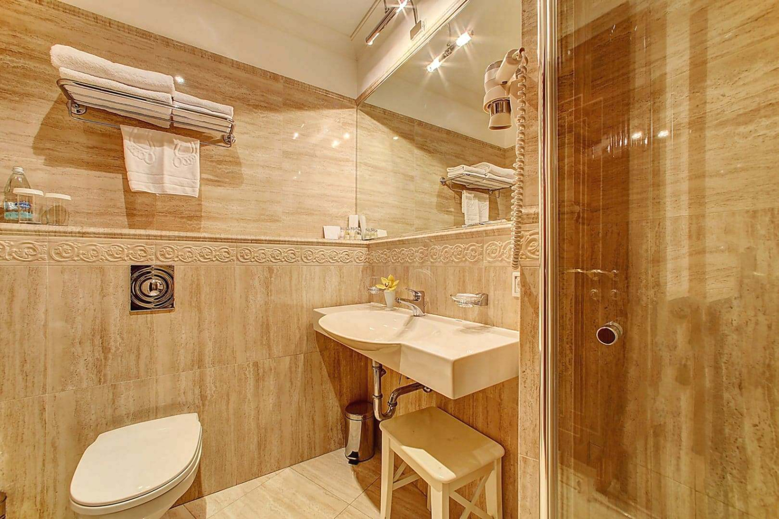 Aussicht auf die Strasse und den ruhigen Innenhof des Hotels. Schlafzimmer – großes 2 Einzelbetten, Teppichboden, Bettbezüge und Vorhänge in Pastellfarben, Stuhl und Schreibtisch mit High-Speed-Internetanschluss, geräumiger Kleiderschrank, Klimaanlage, LCD-Fernseher mit Satelliten-TV und Internetanschluss, Minibar, Safe, Telefon mit Voicemail. Badezimmer mit Duschkabine, Badeartikel, Hausschuhe und Handtücher.