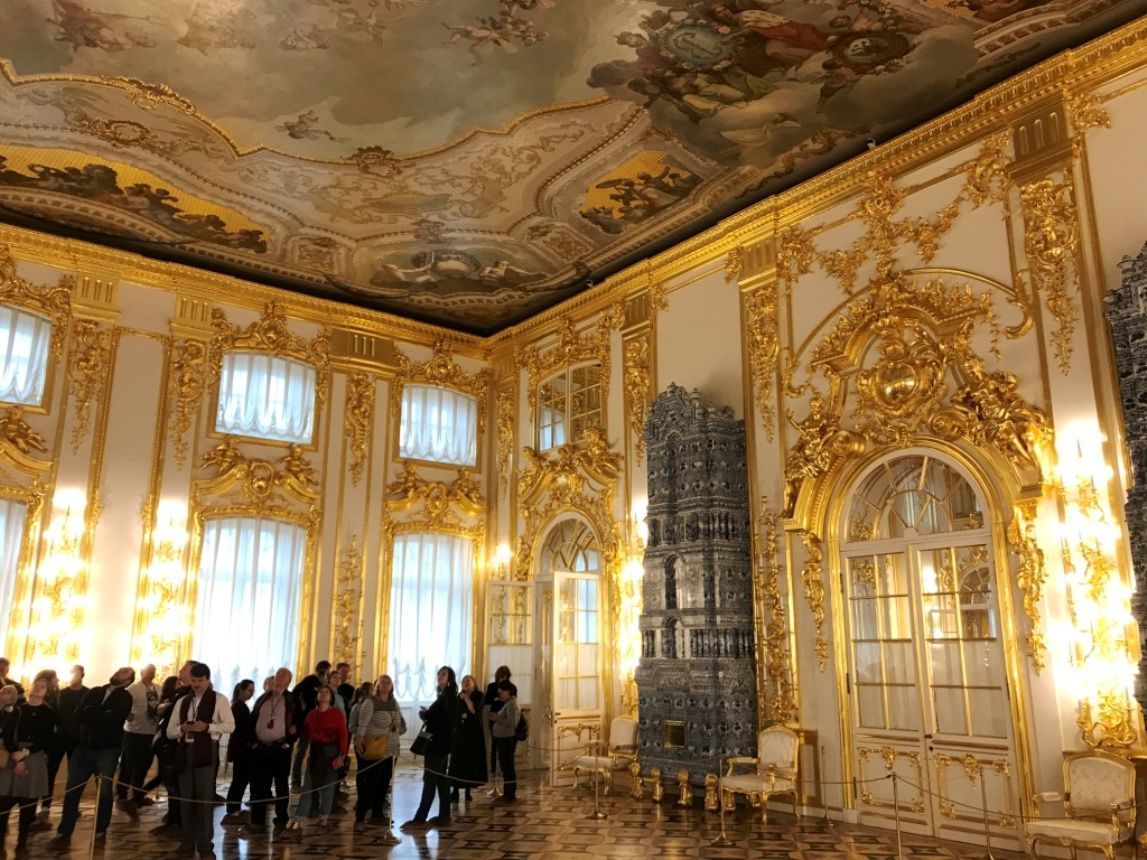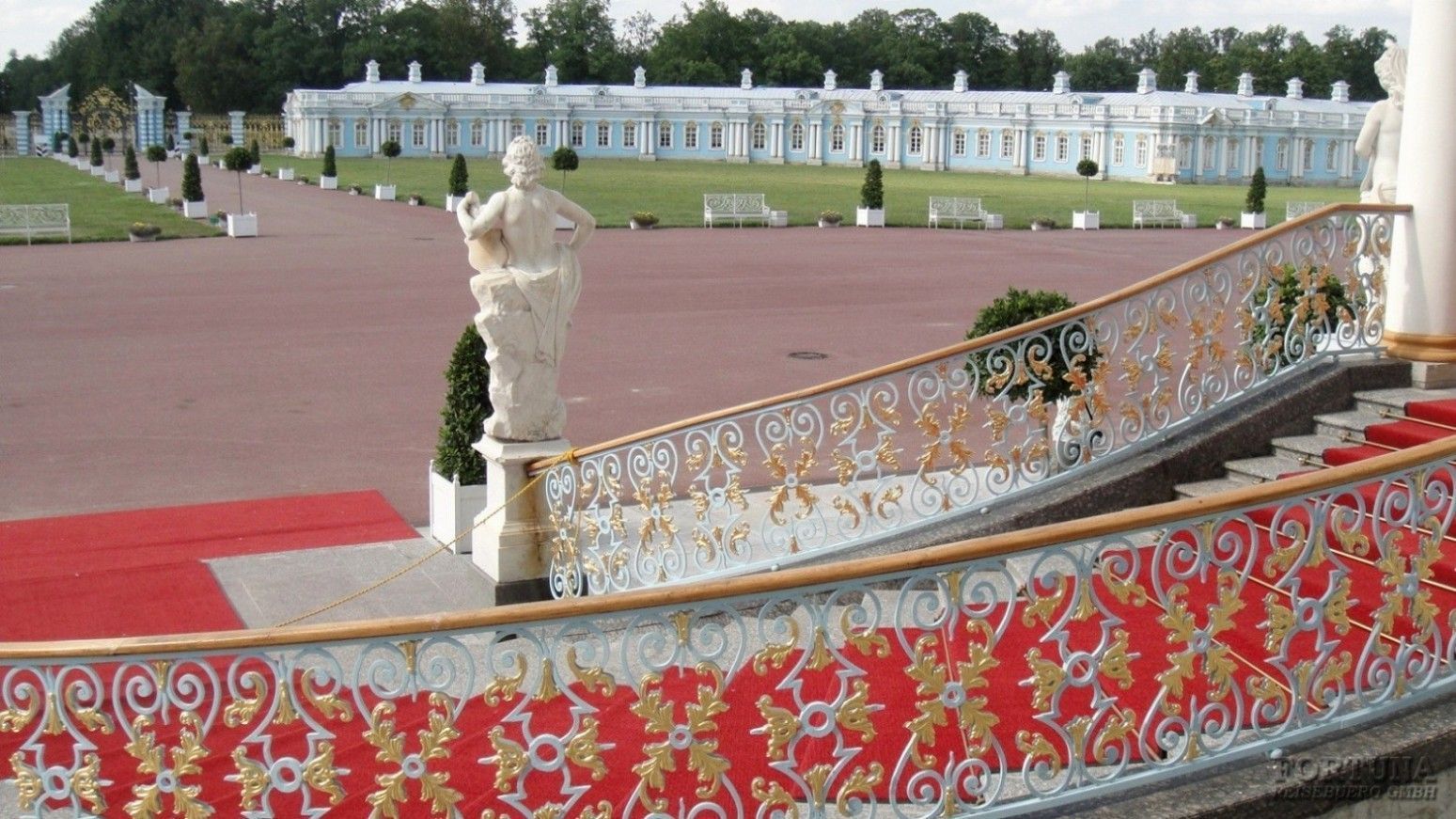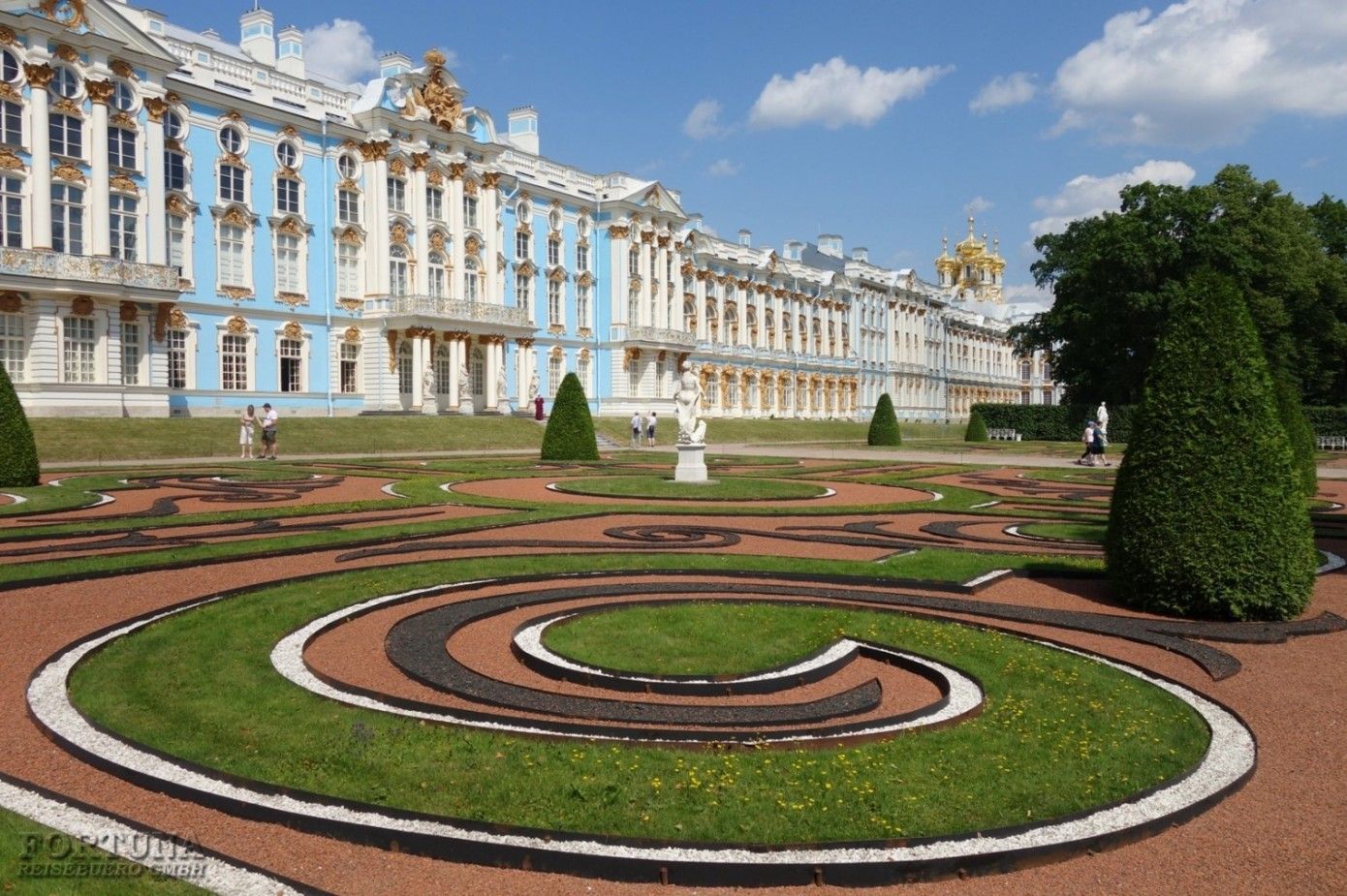 Ausflug nach Puschkin, Besichtigung einer der schönsten ehemaligen Zarenresidenzen, des prachtvollen Katharinenpalast- und Parkensembles. Der prachtvolle Katharinenpalast mit über 300 Meter langer Barock-Fassade ist reich verziert mit Säulen, sowie Figuren von Atlanten, Löwenmasken, Kartuschen und anderen Stuckverzierungen.