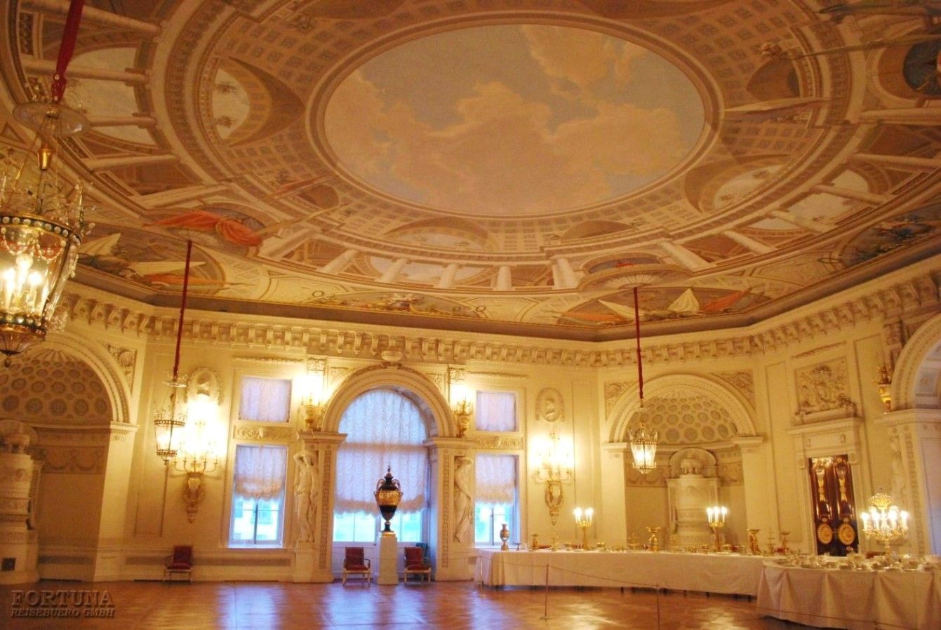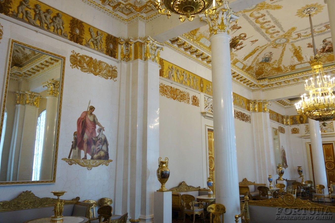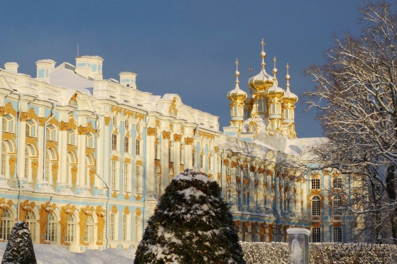 Ausflug nach Puschkin, Besichtigung einer der schönsten ehemaligen Zarenresidenzen, des prachtvollen Katharinenpalast- und Parkensembles. Der prachtvolle Katharinenpalast mit über 300 Meter langer Barock-Fassade ist reich verziert mit Säulen, sowie Figuren von Atlanten, Löwenmasken, Kartuschen und anderen Stuckverzierungen.