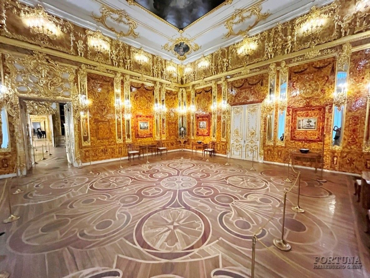 Einer der Höhepunkte des Palastes ist das einmalige und sagenumwobene Bernsteinzimmer, welches ganz und gar mit Bernstein, Spiegeln und Gold verziert ist. Mit Recht gilt dieser Raum als “Achtes Weltwunder”. Kaum zu glauben, in welchen Farben es den Bernstein gibt, von kirschrot über gelb bis zu fast farblos. Anschließend machen Sie einen romantischen Spaziergang durch den sehr gepflegten französischen Park.