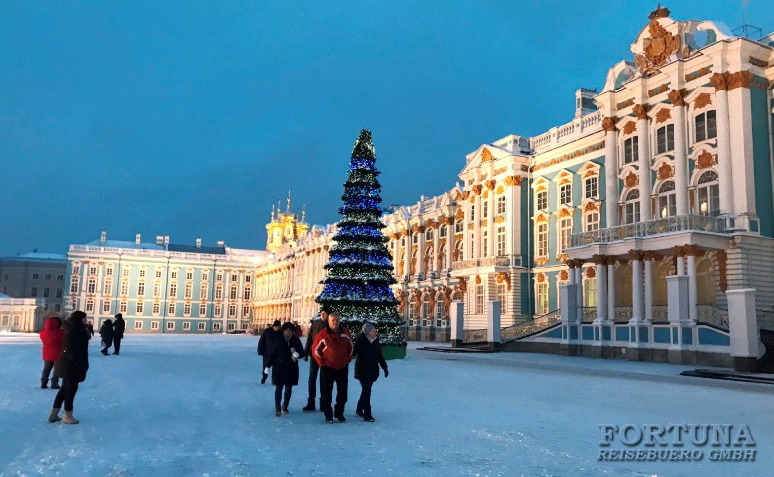 Ausflug nach Puschkin, Besichtigung einer der schönsten ehemaligen Zarenresidenzen, des prachtvollen Katharinenpalast- und Parkensembles. Einer der Höhepunkte des Palastes ist das einmalige und sagenumwobene Bernsteinzimmer. Kaum zu glauben, in welchen Farben es Bernstein gibt, von kirschrot über gelb bis zu fast farblos. Anschließend machen Sie einen romantischen Spaziergang durch den sehr gepflegten französischen Park. Rückkehr in die Stadt.