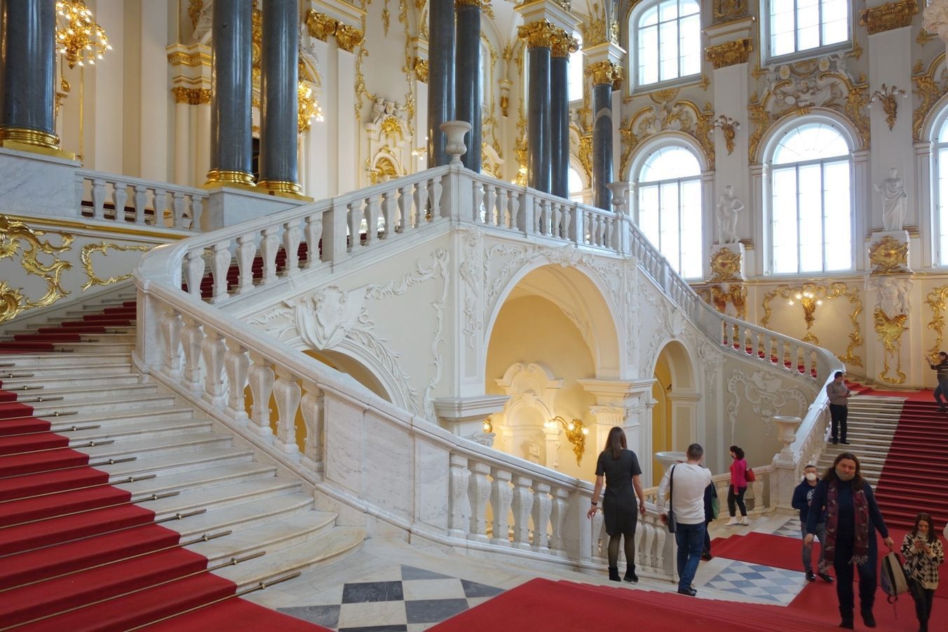 Gleich werden ´´Seine Majestät`` aus seinem bescheidenen Haus treten, der Kutscher wird den Schlag öffnen und ab geht es huldvoll winkend zur täglichen Spazierfahrt. Am Schloßplatz steht der Winterpalast, die ehemalige Zarenresidenz. Der ab 1754 in zehnjähriger Bauzeit errichtete Palast trägt die Handschrift des aus Italien stammenden Architekten Graf Bartolomeo Rastrelli (1700-1771), der seit 1736 russischer Hofbaumeister und mindestens so geschickt war wie der spätere Jongleur fast gleichen Namens. Rastrelli schuf die unnachahmliche Stilform des russischen Barocks, die Lust an Dekor und Farbe auszeichnet. Heute sind in den Räumen des Winterpalastes die Sammlungen der Eremitage ausgestellt. Deren hervorragende Kunst-Kollektion ist auch in vier weiteren angrenzenden Gebäuden zu finden: der Kleinen Eremitage, der Alten Eremitage, der Neuen Eremitage und dem Eremitagetheater. Das Museum besteht seit 1852; es ist mit über drei Mio. Exponaten eines der größten Kunstmuseen Europas mit über 3 Mio. Kunstgegenständen. In 400 Sälen ist die Kunst der Antike, des Orients und Westeuropas zu sehen… Darunter sind Gemälde von Leonardo da Vinci, Rafael, Rembrandt, Picasso und anderen herausragenden Meistern ihrer Zeit....