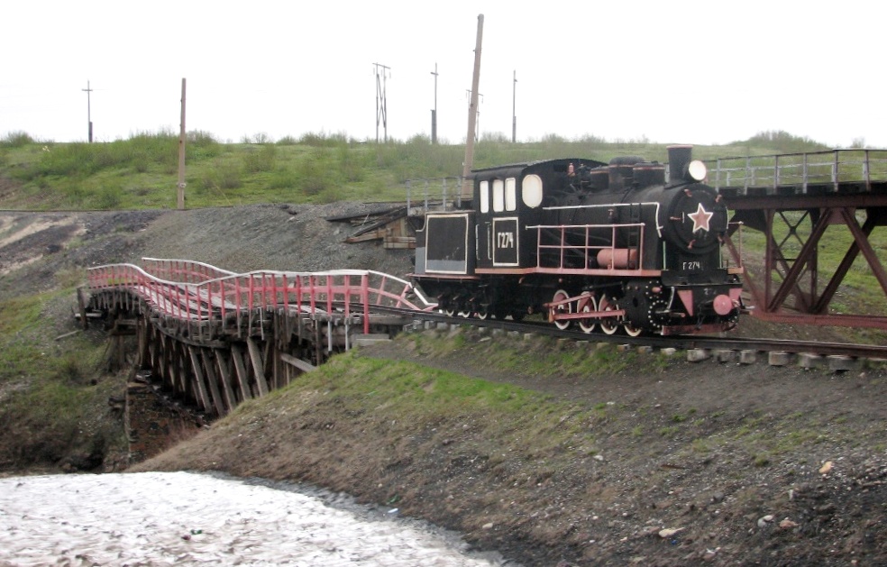 Passage: Ermakovo (hier wurde geplant, eine Eisenbahnbrücke für die Verbindung Norilsk-Salechard zu bauen. Die Brücke wurde nicht gebaut und im Wald "ruhen" Dampflokomotiven für den Transport auf einer nicht vorhandenen Eisenbahn).