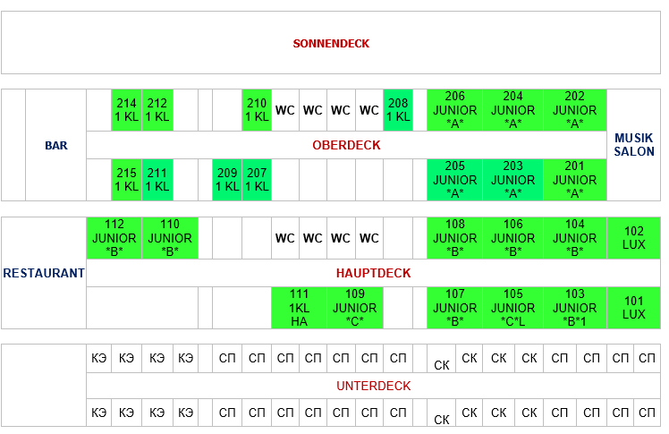 Kabine / Deck | Kabinen № | Fenster | Bade zimmer | Gesamtpreis 8 x Nächte als | |||